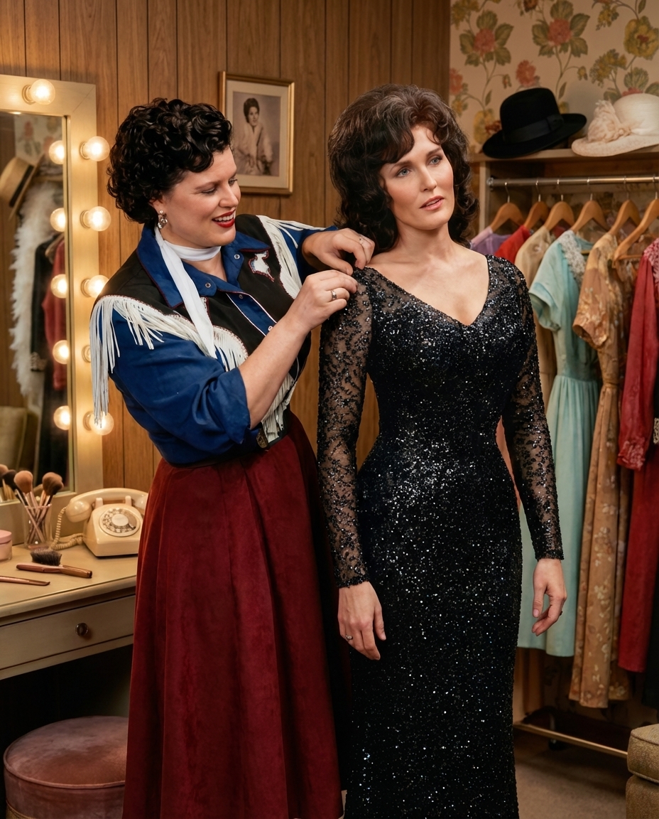 One evening after a show, Patsy Cline quietly motioned for Loretta Lynn to follow. Loretta Lynn stepped into Patsy Cline’s dressing room unsure what to expect. The room smelled faintly of perfume and stage powder, and dresses hung neatly along the wall.